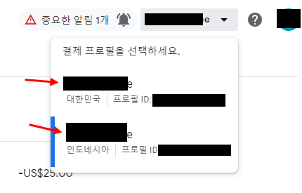 하나는 국가가 대한민국으로 설정되어 있는 결제 프로필이고 다른 하나는 인도네시아로 설정되어 있는 결제 프로필입니다. 결제할때는 사실 크게 상관이 없겠지만, 수익을 낼 때는 반대로 세금을 신고해야 하는 문제가 생기면서 수익지급에 문제가 발생할 수 있습니다. 세금신고가 가능한 국가를 선택하셔야 합니다.
